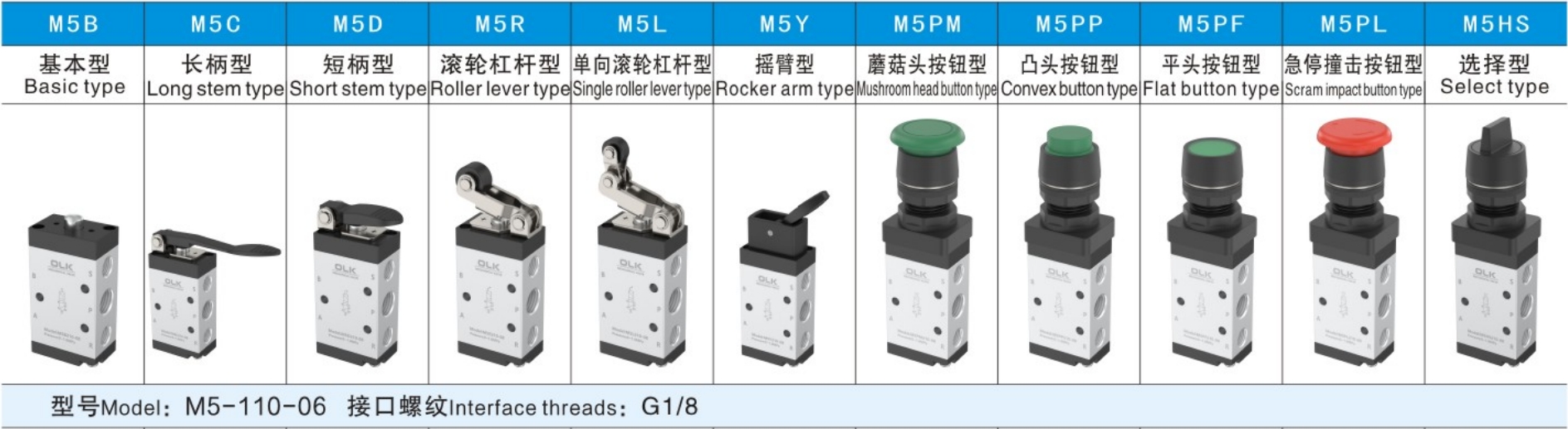 एम 5 मेकॅनिकल वाल्व 2 स्थिती 5 मार्ग आहे; एम 3 मेकॅनिकल वाल्व 2 पोझिशन 3 मार्ग आहे.