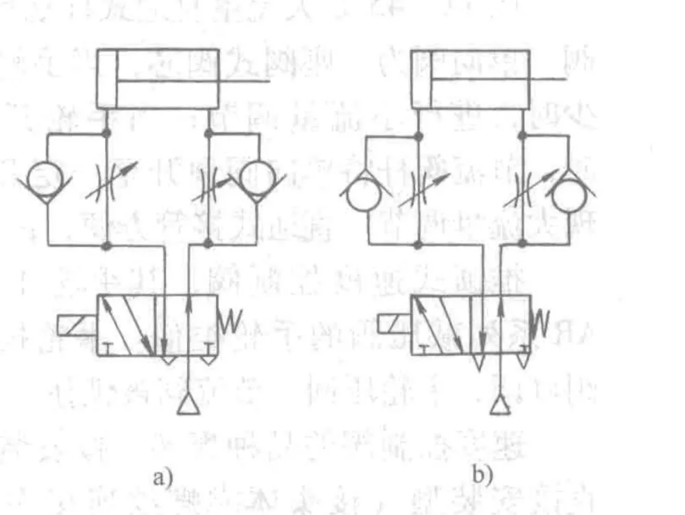 · (a) (एक्झॉस्ट थ्रॉटलिंग) मध्ये, जेव्हा दिशात्मक झडप सक्रिय होते, तेव्हा सिलेंडरच्या इनलेट बाजूवरील चेक व्हॉल्व्ह उघडतो, ज्यामुळे रॉडलेस बाजू लवकर भरते. रॉडच्या बाजूची हवा फक्त थ्रॉटल व्हॉल्व्हमधून बाहेर पडू शकते. थ्रोटल ओपनिंग समायोजित करून, सिलेंडरचा वेग नियंत्रित केला जाऊ शकतो. ही पद्धत पिस्टनची स्थिर हालचाल प्रदान करते आणि सर्वात सामान्यपणे वापरली जाणारी सर्किट आहे.