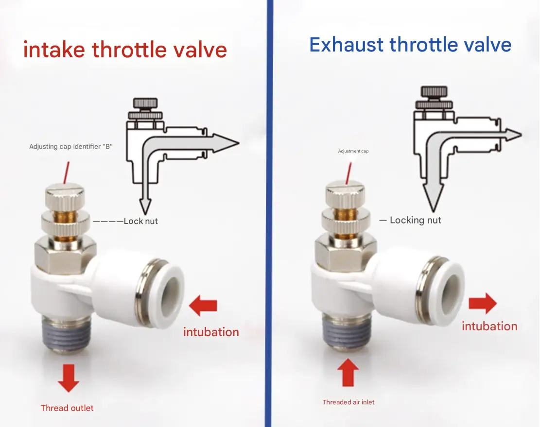 इनलेट थ्रॉटल वाल्व्ह ट्यूबद्वारे हवा आत घेतात आणि थ्रेडेड पोर्टद्वारे एक्झॉस्ट करतात; एक्झॉस्ट थ्रॉटल वाल्व्ह थ्रेडेड पोर्टद्वारे हवा आत घेतात आणि ट्यूबद्वारे एक्झॉस्ट करतात.
