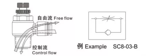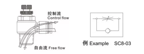 फंक्शनल चिन्हांवरून, आपण पाहू शकतो की एक्झॉस्ट आणि इनलेट फ्लो कंट्रोल व्हॉल्व्ह हे दोन्ही एकमार्गी थ्रॉटल व्हॉल्व्ह आहेत, उलट हवेचा प्रवाह मुक्तपणे जाऊ देत असताना केवळ एकाच दिशेने प्रवाह नियंत्रित करतात. डबल-ॲक्टिंग सिलेंडरसाठी, सिलेंडरच्या हालचालीची स्थिरता सुधारण्यासाठी एक्झॉस्ट थ्रॉटल वाल्व्हला प्राधान्य दिले जाते. एकल-अभिनय सिलिंडरसाठी, जे सामान्यत: हवा पुरवठा नसताना विस्तार किंवा मागे घेण्यासाठी स्प्रिंग वापरतात, ऑपरेशन दरम्यान गॅसने स्प्रिंग फोर्सवर मात करणे आवश्यक आहे, त्यामुळे इनलेट थ्रॉटल वाल्व्ह वेग नियंत्रणासाठी योग्य आहेत.