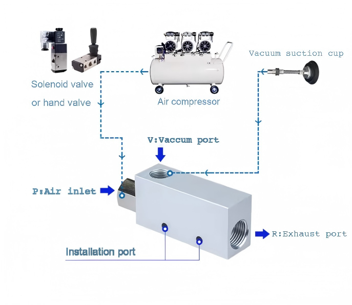व्हॅक्यूम पंप आणि व्हॅक्यूम जनरेटर. व्हॅक्यूम पंप हे एक यांत्रिक उपकरण आहे जे सक्शन पोर्टवर नकारात्मक दाब निर्माण करते आणि एक्झॉस्ट पोर्टला थेट वातावरणातून जाऊ देते, गॅस काढण्यासाठी दोन्ही टोकांना उच्च दाबाचे प्रमाण असते. व्हॅक्यूम जनरेटर हा एक वायवीय घटक आहे जो विशिष्ट प्रमाणात व्हॅक्यूम तयार करण्यासाठी संकुचित हवेच्या प्रवाहाचा वापर करतो. व्हॅक्यूम पंपच्या तुलनेत, त्याची साधी रचना, लहान आकारमान, हलके वजन, कमी किंमत, सोयीस्कर स्थापना, सहाय्यक घटकांसह सोपे कंपाऊंडिंग, जलद निर्मिती आणि व्हॅक्यूम सोडणे, आणि कमी प्रवाह दरासह अधूनमधून काम करण्यासाठी योग्य, विखुरलेल्या वापरासाठी योग्य आहे.