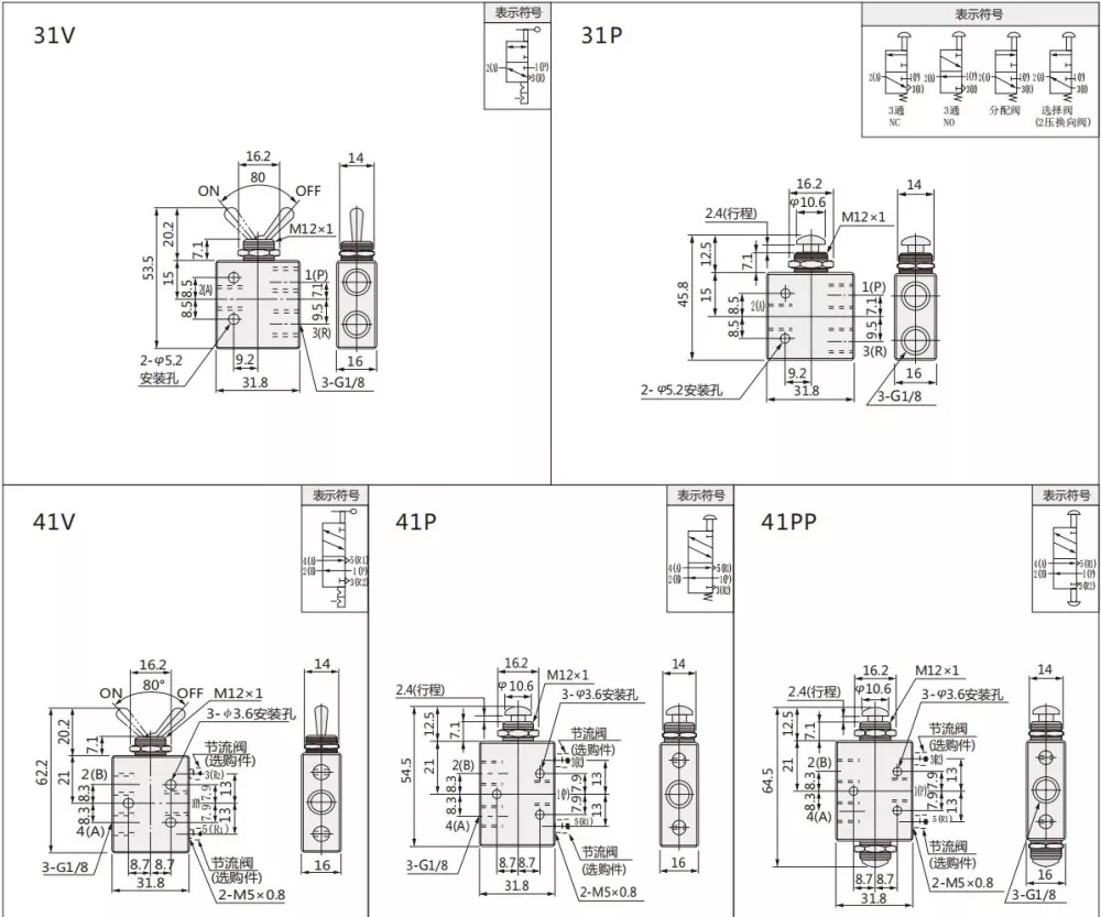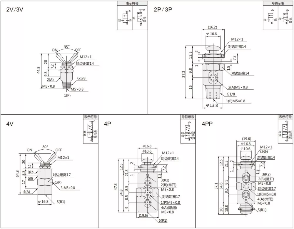 टीएसी मालिका टॉगल वाल्वमध्ये 2 स्थान 2 मार्ग आहे, 2 स्थिती 3 मार्ग आणि 2 स्थिती 5 मार्ग निवडला जाऊ शकतो. लीव्हर प्रकार आणि दोन प्रकारचे धागा: एम 5, जी 1/8.