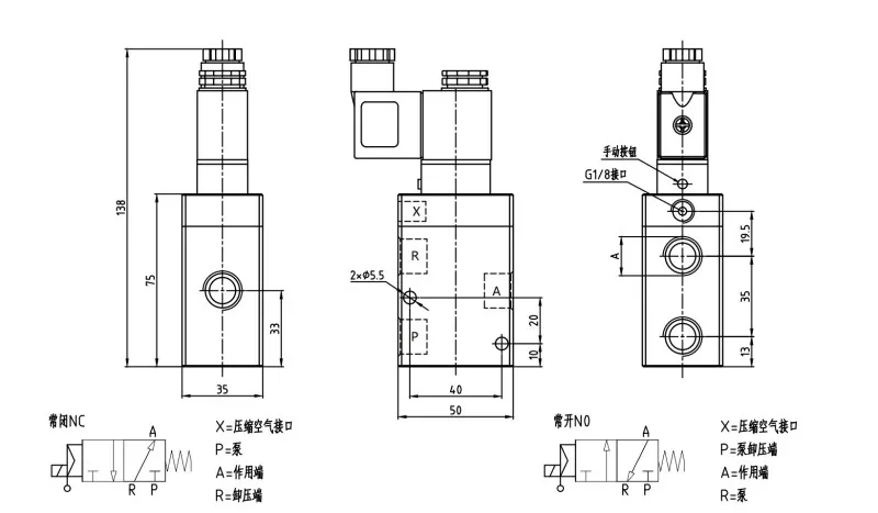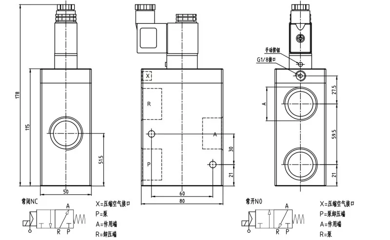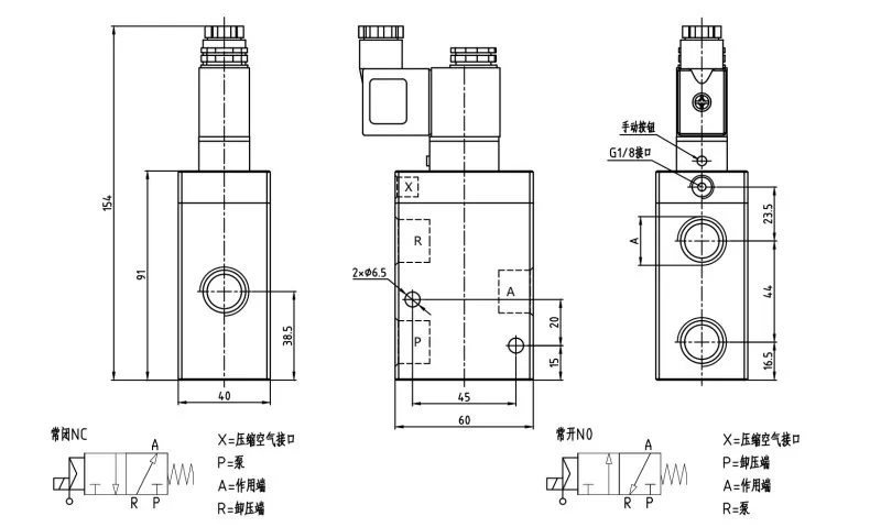जी 1/8 मधील संकुचित एअर पोर्ट (एक्स) सह थ्रेडेड पोर्ट (पी, ए, आर) आकार जी 3/8, जी 1/2 आणि जी 1 मध्ये उपलब्ध आहेत.
